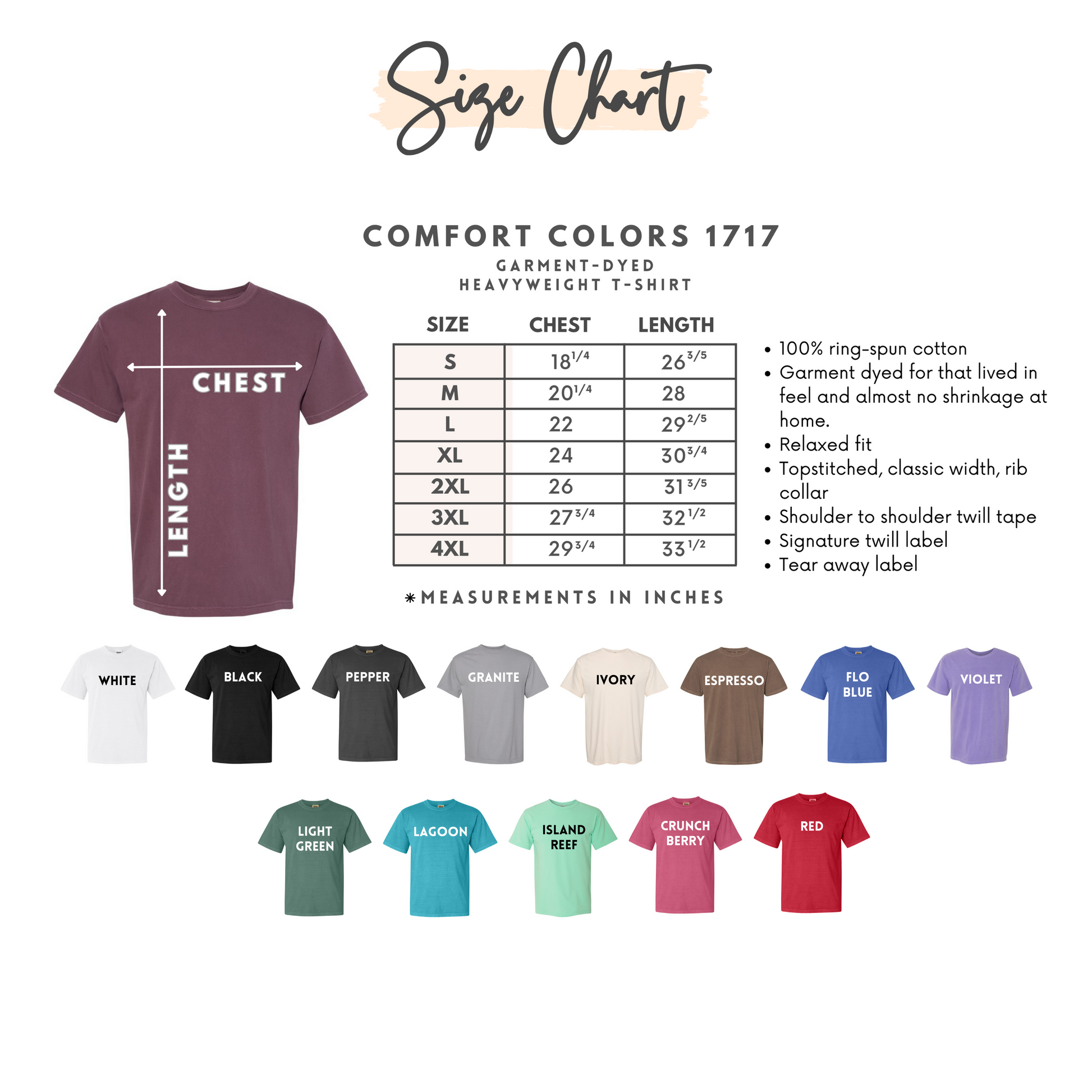 - Refer to the size & color charts in the photos to see what is available for each style.