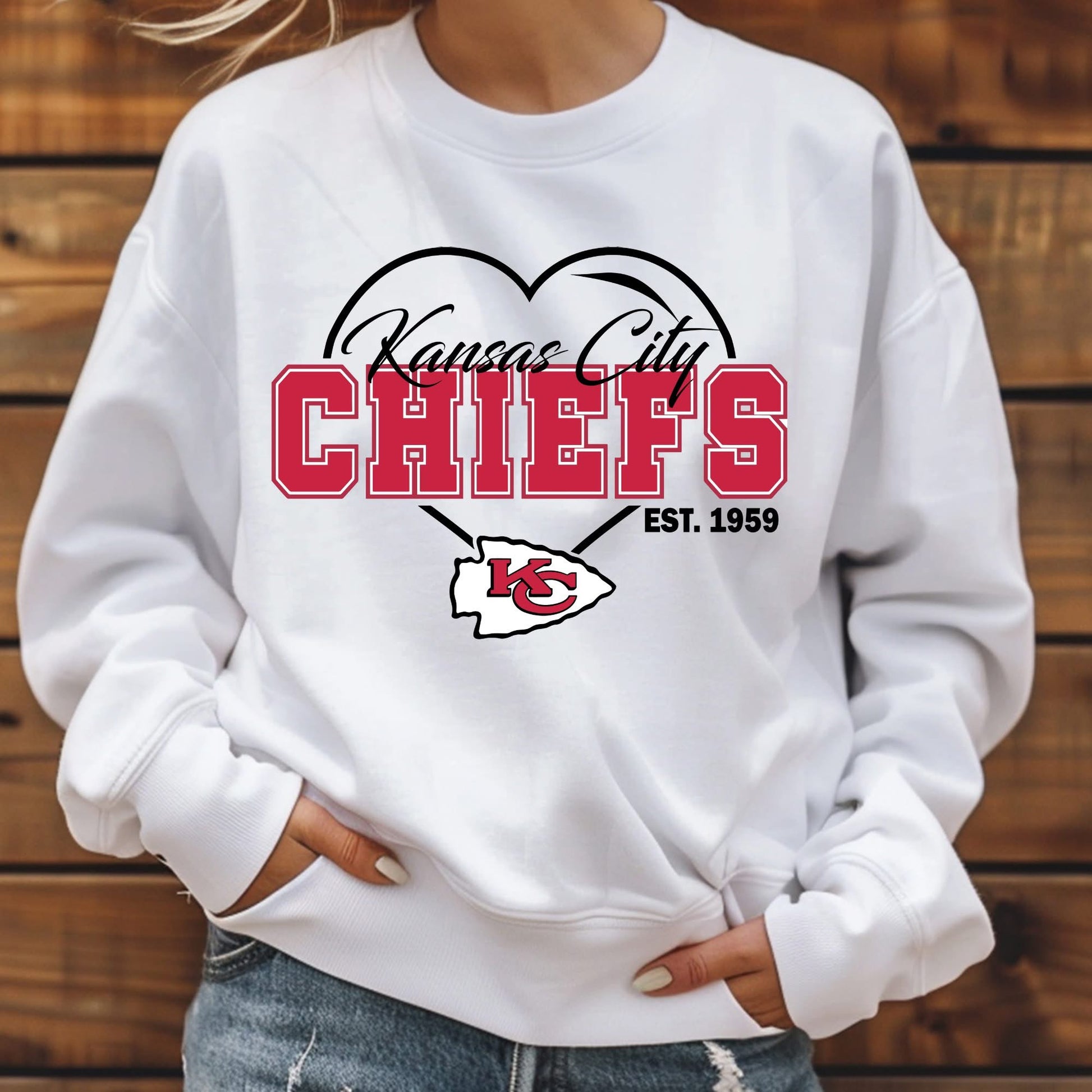 Show your Kansas City pride on game day with this cozy unisex sweatshirt! Designed with a bold red & gold heart graphic and “Est. 1959” detail, this crewneck is the perfect fan pullover for football season.
