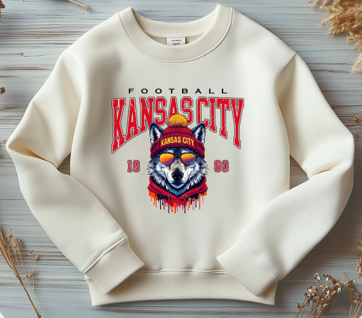 Rep Kansas City in style! This cozy sweatshirt or T-Shirt features a bold wolf design with retro football vibes. Perfect for game day or everyday wear.
